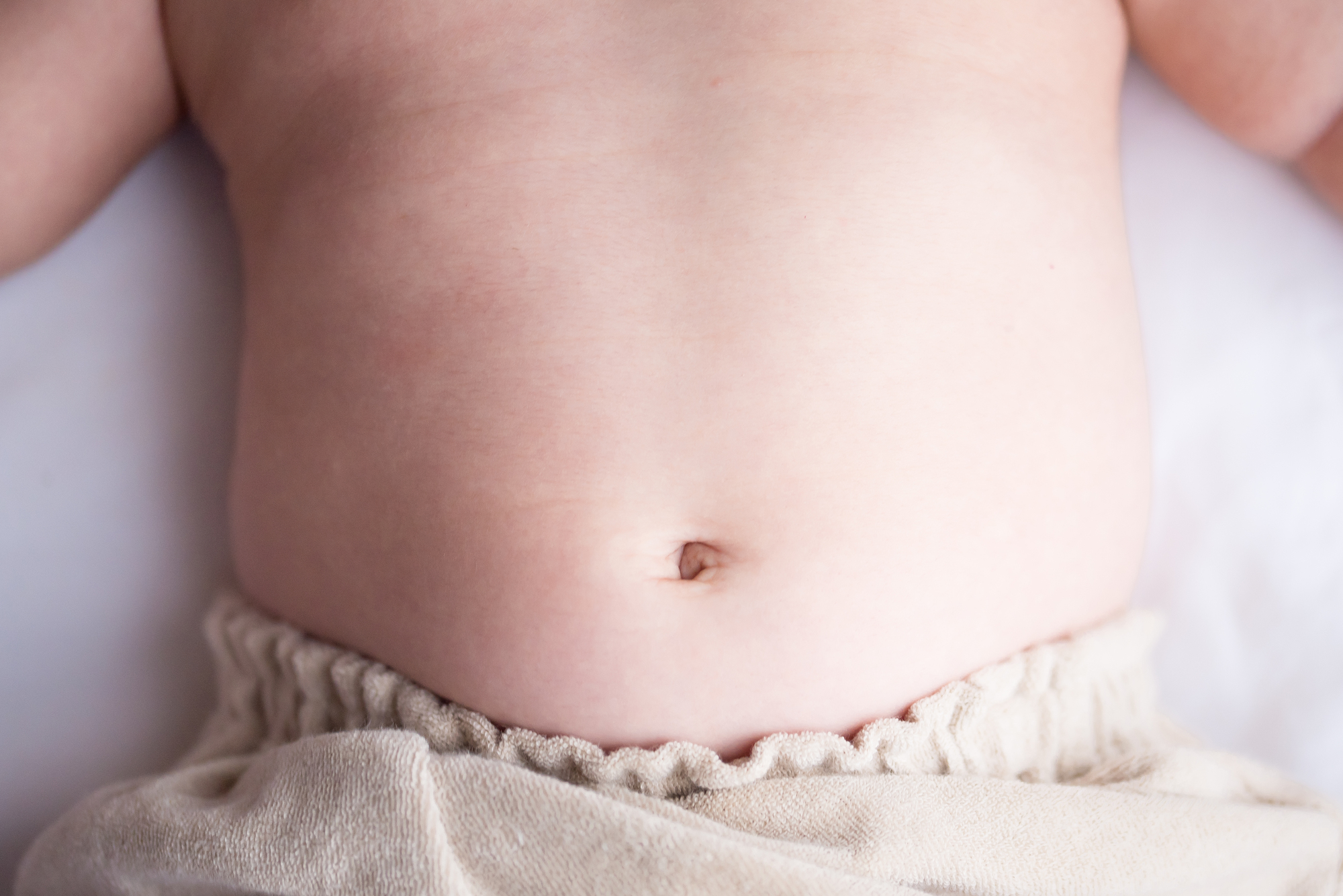 赤ちゃんの臍(さい)ヘルニア、いわゆる“でべそ”は、赤ちゃんの5人から10人に1人の割合でみられます。へその緒が取れた直後の臍輪がふさがっていない時期に泣いたりいきんだりすると、臍部に腸が飛び出してきて、“でべそ”になります。“でべそ”は生後3ヶ月頃まで大きくなり、大きいものでは直径4cm近くになることがあります。